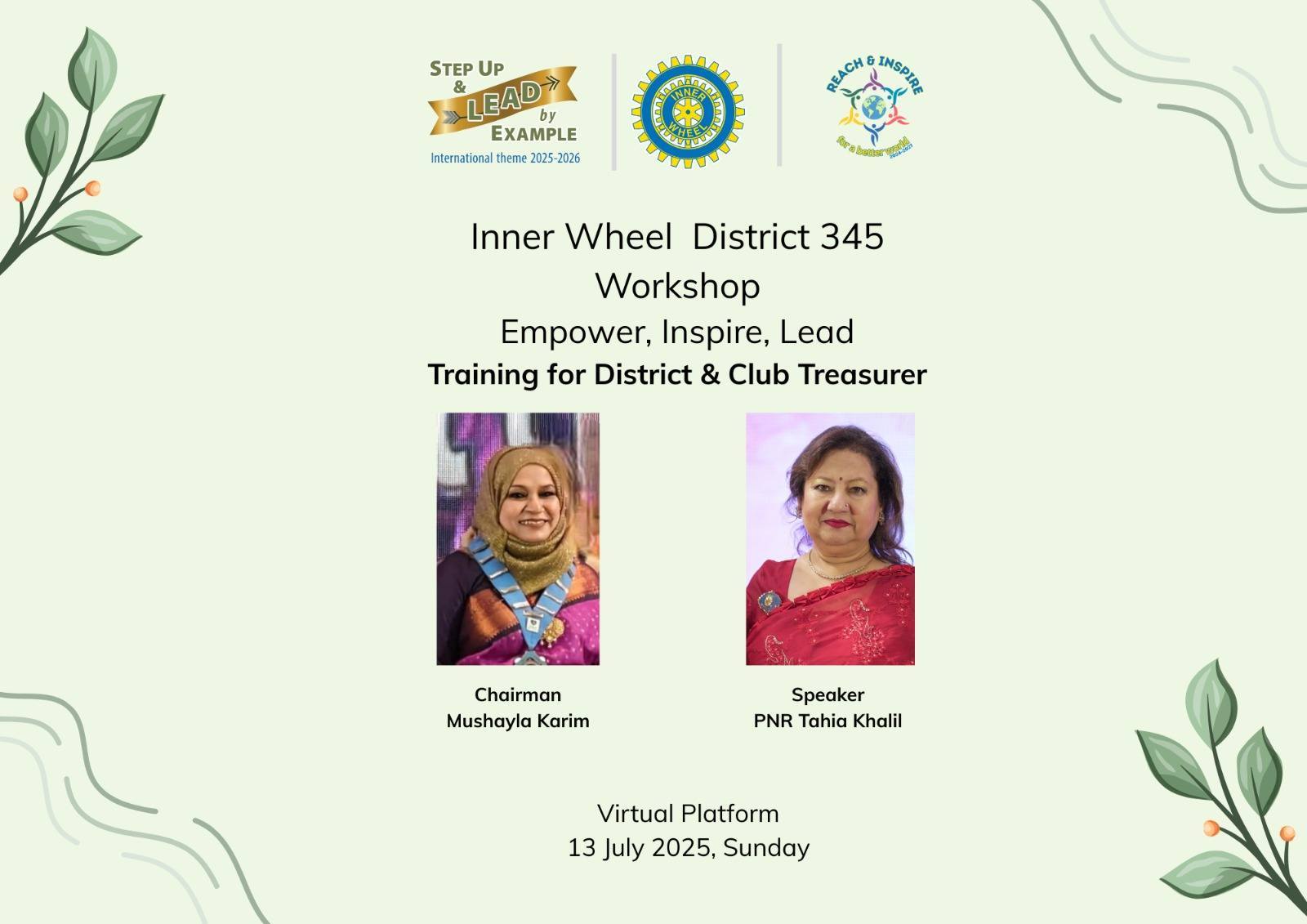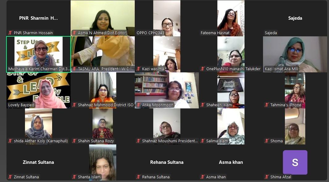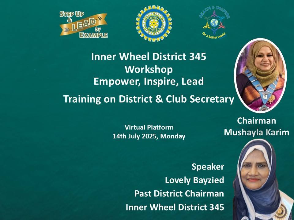 D345 organised workshops in 4 phases. On 9th June, 13th June, 14th June & 15th June 2025- these workshops were held. These virtual training session’s topic were different offices of Club & District level. It was an interactive learning session for the members. Speakers were PIIWBD Dilruba Ahmed, PIIWBM Bulbul Alam, PNR Tahera Muzaffar, PDC Lovely Bayzied, PNR Sharmin Hossain, PNR Tahia Khalil, PNR Rosy Ahad, PNR Mohsena Reza, PDC Tahera Wahis, PDC Sharmeen Rahman & PDC Angela Baishakhi Memdes. All sessions were presided by D345 Chairman Mushayela Karim.